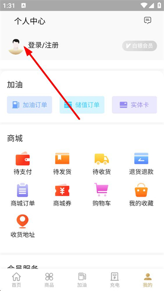 2、個人中心頁面,有加油、商城相關功能入口,點擊登錄、注冊區域,進入授權登錄的操作界面,推進賬號登錄流程。