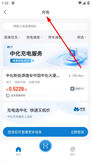 4、登錄后點擊底部充電選項,進入充電頁面,可搜索充電站,查看充電服務信息,享受對應的充電權益。