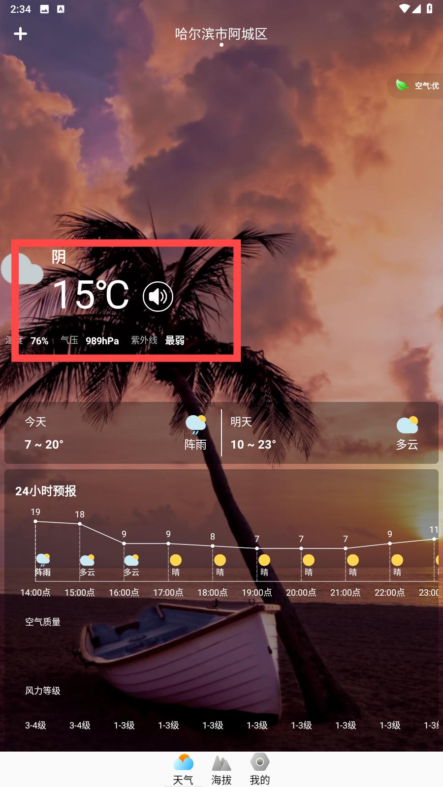 3、進入主頁面后,可以查看該地區的溫度天氣,下不下雨,空氣質量,風力強度等等,實在是非常方便呢。