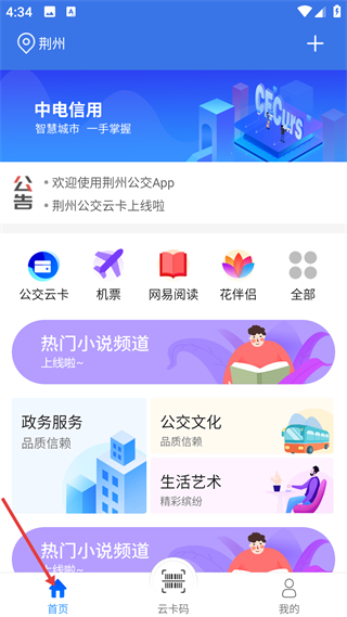 3、進入首頁可看到公交云卡機票等功能入口,還有政務服務公交文化等板塊,能使用各類生活服務相關功能,便捷日常出行與生活。