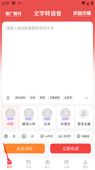 2、制作界面,可輸入文字選主播音色,支持逐句試聽、文案提取等功能,點擊立即合成生成語音內容。
