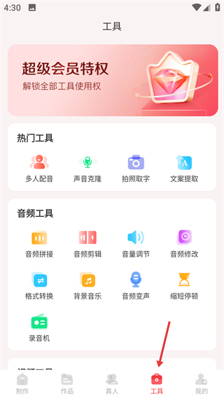 4、工具功能區,含多人配音等熱門工具及音頻處理工具,超級會員可解鎖全部工具使用權,助力音頻內容制作。