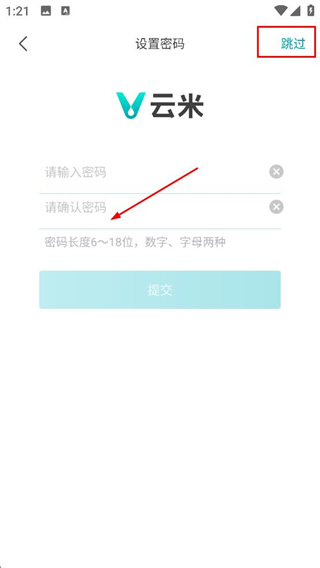 3、登錄后進入設置密碼頁面可輸入密碼并確認密碼,也可點擊跳過不設置密碼。