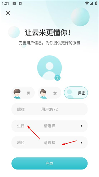 4、進入完善用戶信息頁面選擇性別、填寫昵稱、生日和地區,完善信息后點擊完成,以便云米提供更好的服務。