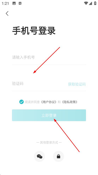 2、在手機號登錄頁面輸入手機號,獲取并輸入驗證碼,閱讀并同意用戶協議和隱私政策后點擊立即登錄。
