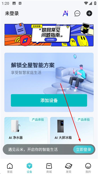 1、進入云米APP未登錄頁面,可查看聯網常見問題指南和全屋智能方案,點擊立即登錄可進入登錄頁面。
