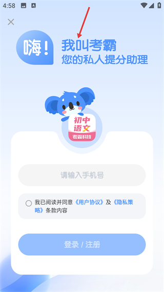 1、進入應用先進入登錄界面顯示考霸是私人提分助手需輸入手機號勾選同意用戶協議及隱私策略條款后點擊登錄注冊完成賬號驗證。