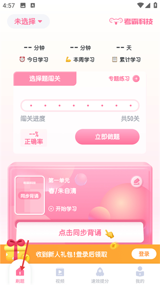 2、登錄后進入刷題頁面可查看今日本周累計學習時長設選擇題闖關專題練習功能還有同步背誦板塊點擊立即做題即可參與闖關練習。