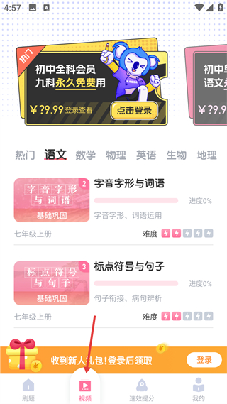 3、切換到視頻頁面可選擇不同學科展示對應學科的基礎鞏固模塊如語文的字音字形與詞語等標注進度與難度便于選擇對應學習內容。
