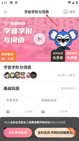4、進入具體課程頁面如字音字形與詞語課程顯示同步教材版本及觀看人數包含對應知識點小節需開通會員即可觀看課程內容進行學習。