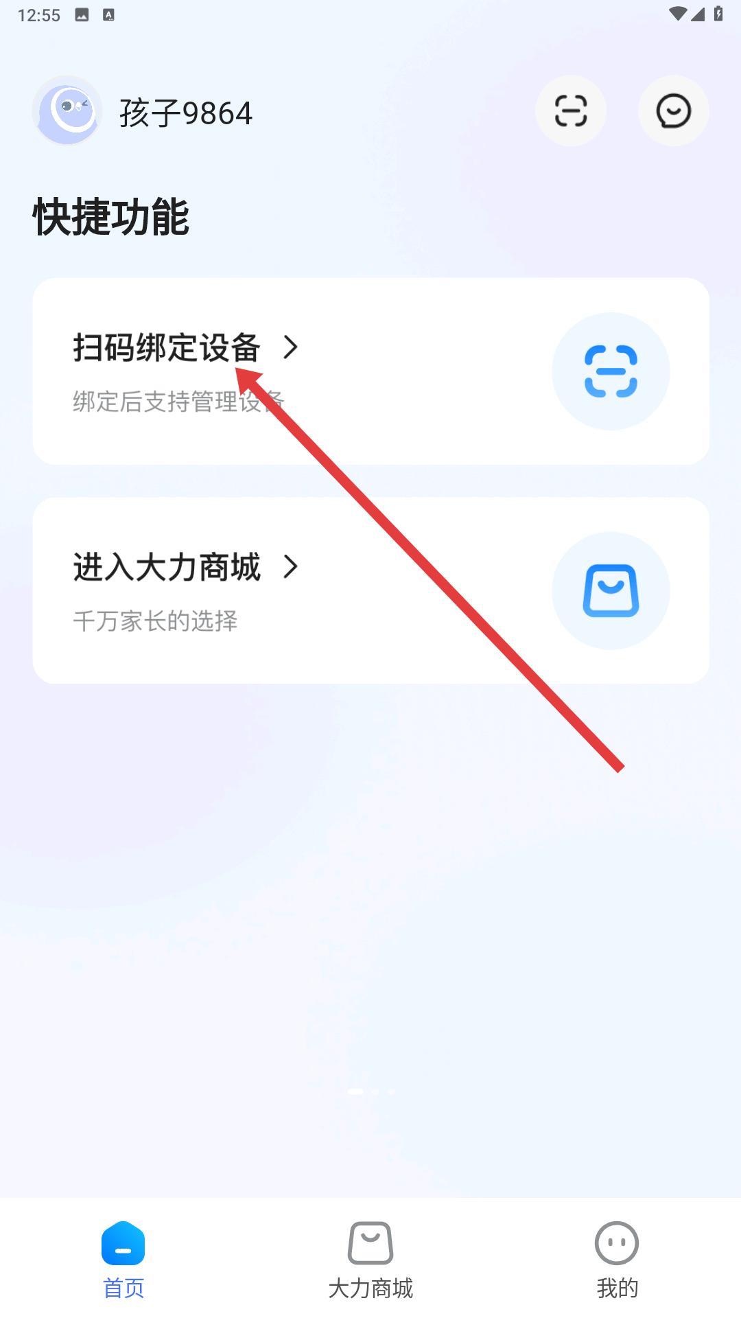 2、首頁的快捷功能板塊,點擊掃碼綁定設備,進入掃碼界面。