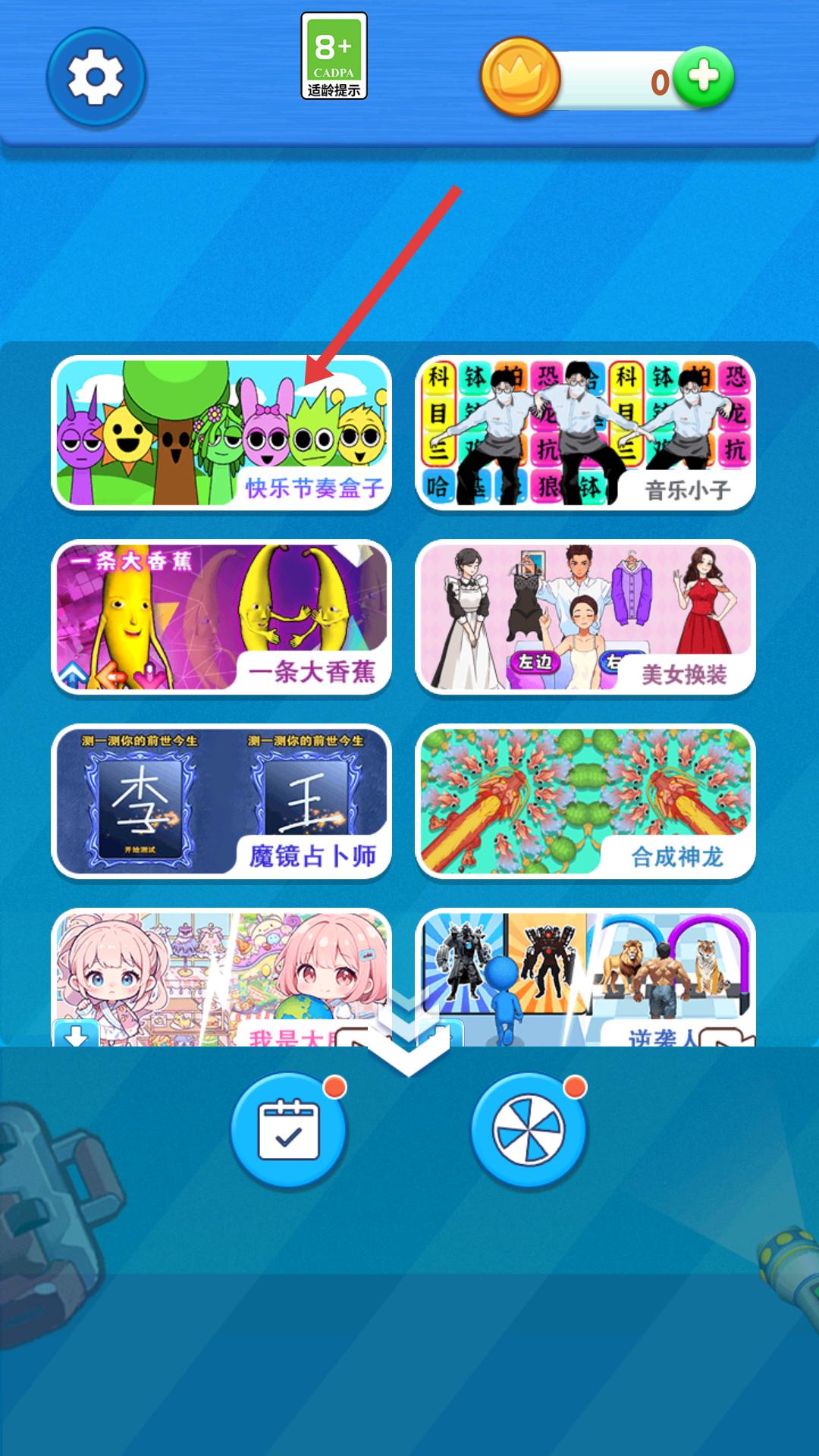 1、在游戲選擇界面,點擊【快樂節奏盒子】,即可進入該游戲模塊,開啟后續的角色裝扮與節奏互動體驗。