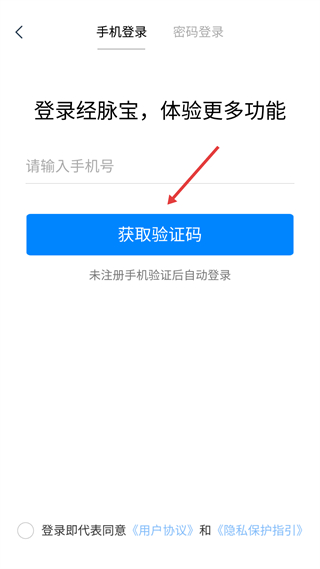 1、進入經脈寶的手機登錄界面,先在輸入框填寫手機號,勾選同意相關協議后,點擊獲取驗證碼,未注冊手機驗證后可自動登錄。