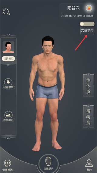 2、進入主界面可看到陽谷穴展示,點擊穴位學習可了解穴位知識,還能通過切換模型更換展示形象,同時有測體質辨疾病等功能入口。