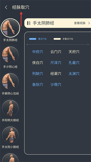 3、進入經脈取穴頁面,可選擇手太陰肺經等不同經脈分類,頁面會展示對應經脈的重點與非重點穴位,點擊查看經脈能獲取更詳細的經脈信息。