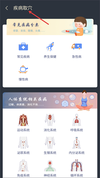 4、進入疾病取穴頁面,可看到常見疾病養生保健等分類,也有人體系統相關疾病板塊,涵蓋運動消化等多個系統的疾病取穴指引。