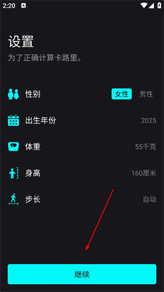 1、打開軟件進入設置頁面,填寫性別出生年份體重身高等信息,確認信息后點擊繼續按鈕,完成基礎信息配置。