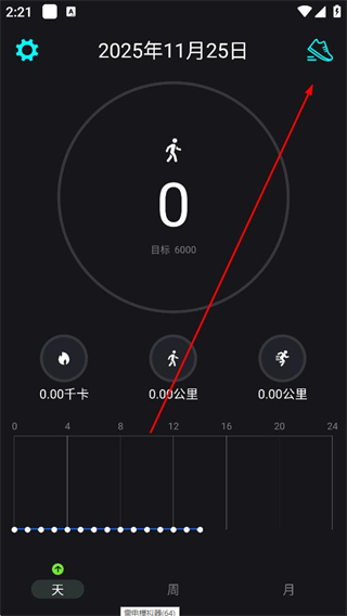 2、進入運動記錄主頁面,查看當日的步數目標及卡路里公里數等數據,點擊右上角的跑步按鈕,進入跑步設置界面。