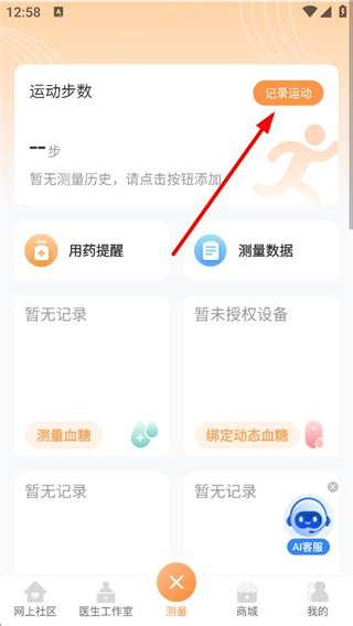 2、進入測量界面,可記錄運動步數,使用用藥提醒測量數據等功能,也能進行血糖測量、綁定動態血糖等操作,管理自身健康數據。