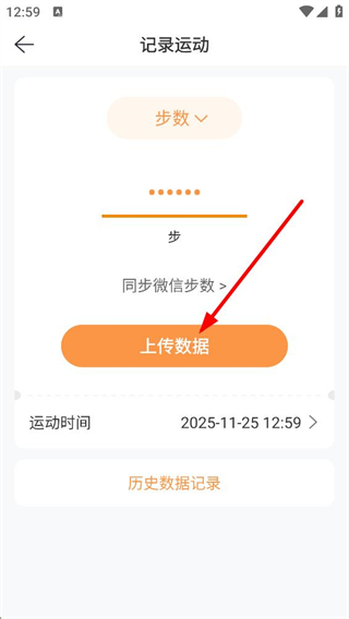 3、進入記錄運動界面,可選擇記錄步數,支持同步微信步數,填寫后點擊上傳數據,即可記錄本次運動信息,還能查看運動時間和歷史數據。