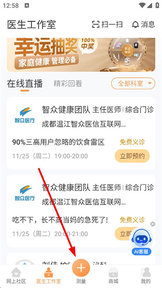 1、進入醫生工作室界面,可查看在線直播的義診活動,選擇對應場次點擊立即預約,還能切換精彩回看查看往期內容,獲取健康相關知識。
