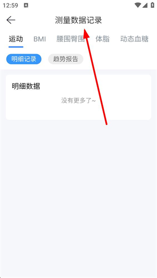 4、進入測量數據記錄界面,可切換運動BMI等不同數據類型,查看明細記錄或趨勢報告,了解自身各項健康數據的變化情況。