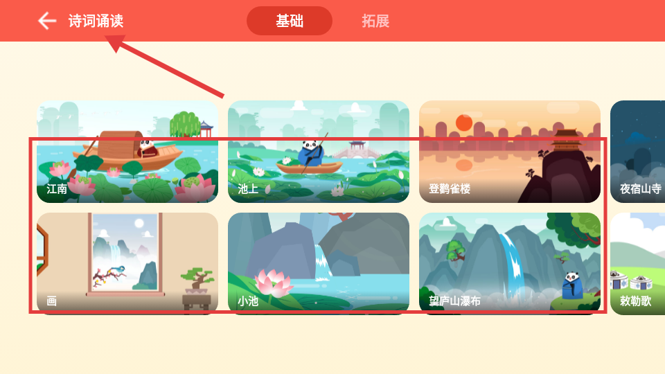 2、詩詞誦讀頁面陳列江南登鸛雀樓等經典古詩,分基礎與拓展板塊,借精美畫面輔助,引領孩子感受詩詞魅力。