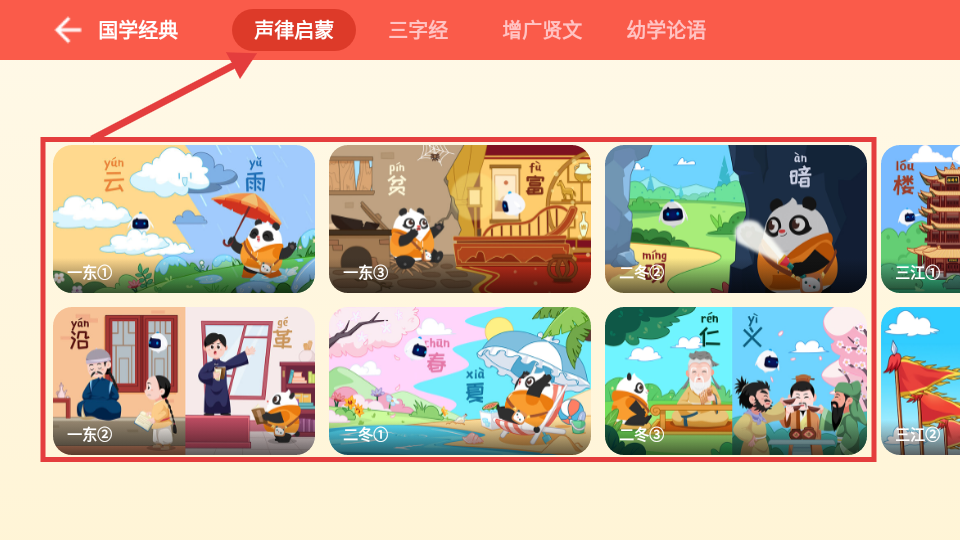 3、國學經典頁面,涵蓋聲律啟蒙、三字經等類別,以可愛的熊貓形象融入場景,展示云雨等字詞內容助力國學學習。