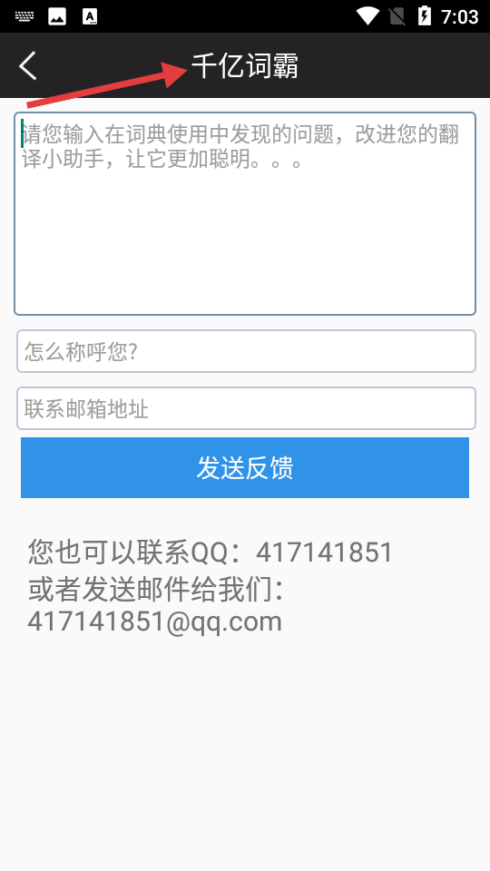 1、千億詞霸的意見反饋頁面,用戶可在此輸入詞典使用問題,填寫稱呼與郵箱地址后發送反饋,也可通過QQ或郵件聯系。