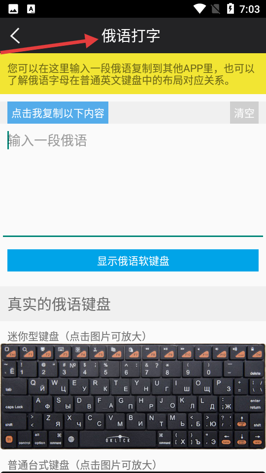 2、俄語打字頁面既能輸入俄語復制到其他APP,又能了解字母在英文鍵盤的布局,還可顯示俄語軟鍵盤查看真實鍵盤樣式。