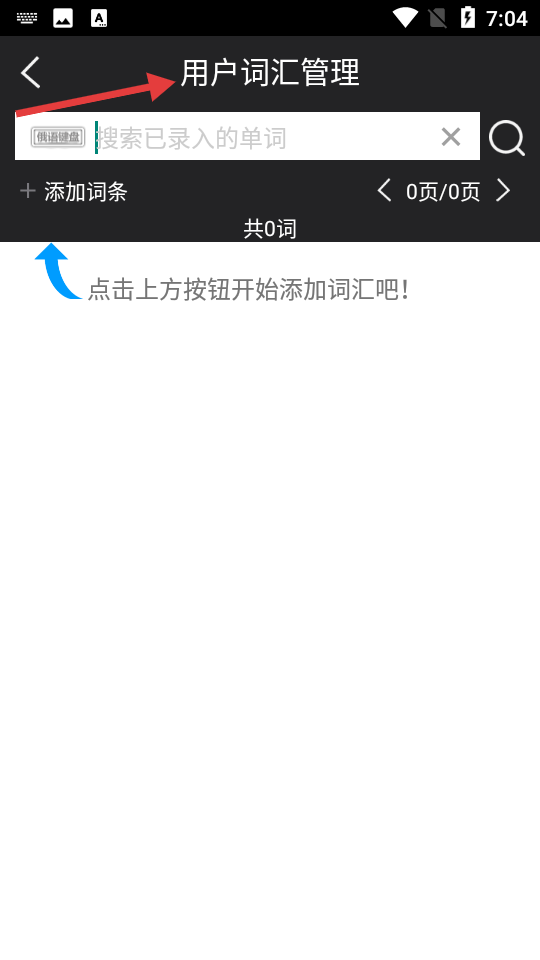 3、用戶詞匯管理頁面能搜索已錄入單詞,點擊添加詞條可開始添加詞匯,當前顯示共0詞方便用戶管理個人詞匯。