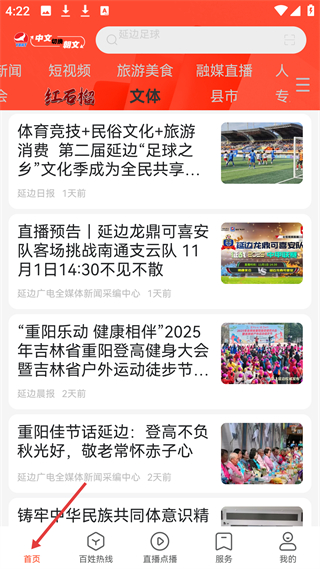 1、首頁,文體欄目發布延邊足球之鄉文化季、足球賽預告、重陽健身大會、敬老等資訊,展現本地文體民俗動態。