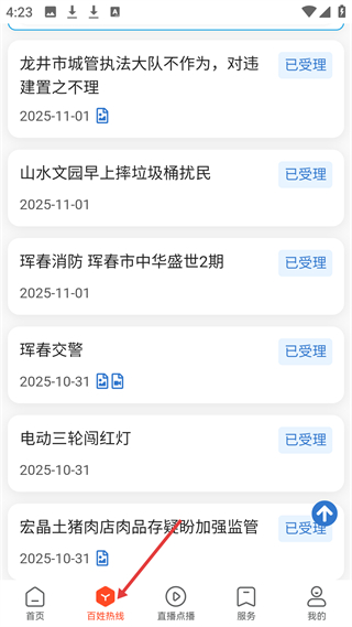 2、百姓熱線板塊,展示龍井城管、山水文園垃圾擾民等訴求工單,均已受理,體現民生訴求處理進度。