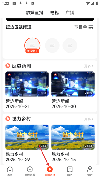 3、直播點播板塊,有融媒直播等分類,提供延邊衛視直播,還有延邊新聞、魅力鄉村等節目點播,覆蓋本地新聞鄉村內容。