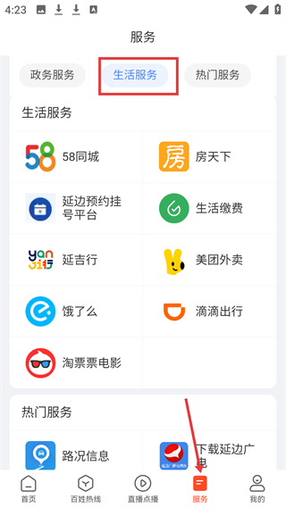 4、服務板塊,生活服務涵蓋58同城、房天下等,還有預約掛號、生活繳費等,熱門服務含路況信息查詢。