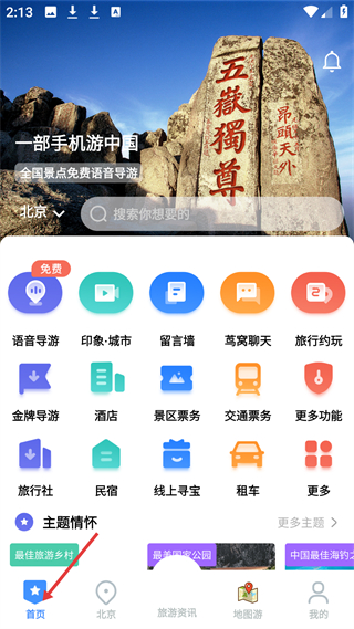 1、首頁推全國景點免費語音導游,設語音導游、酒店等入口,還有主題板塊,方便用戶獲取旅游服務和資訊。