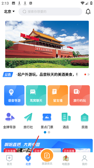 2、北京板塊展示景點資訊,設語音導游、旅行約玩等入口,還有直播板塊,助力用戶了解北京旅游信息和活動。
