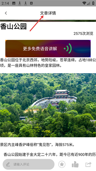 3、文章詳情板塊以香山公園為例,展示景區介紹、圖片及免費語音講解入口,方便用戶深入了解景點信息。
