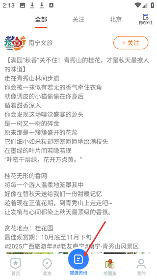 4、旅游資訊板塊涵蓋各地旅游資訊,可查看全部、關注等分類內容,助力用戶獲取最新旅游動態和推薦。