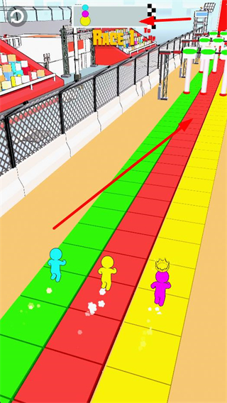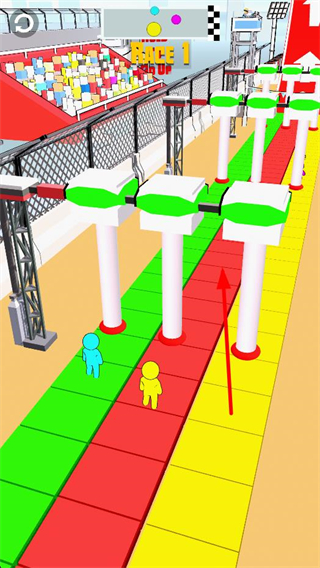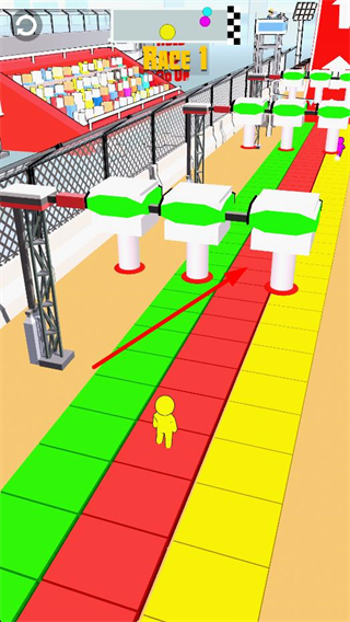 2、在賽道上操控角色移動,當遇到裝置提示時立即停止動作,避免被淘汰,推進賽道進度。