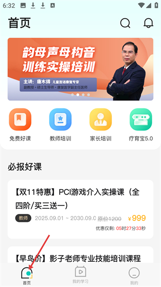 1、首頁板塊有免費好課、教師培訓等功能入口,推必報好課如PCI游戲介入實操課,展示課程優惠信息,助用戶了解特教培訓。