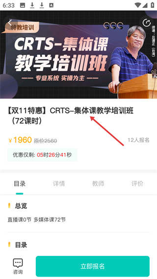 4、課程詳情板塊以CRTS集體課培訓班為例,示雙11特惠價、72課時,支持咨詢報名,助力教師系統學習特教教學。