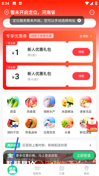 1、進入精選頁面,可領取新人優惠禮包,通過蔬菜、肉禽蛋等品類入口選擇商品,還能查看“買菜就上集時鮮,新鮮配送到家”的配送服務提示。