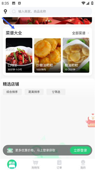 2、進入包含菜譜大全的頁面,可瀏覽菜譜大全中的菜品,查看精選店鋪板塊,還能通過綜合排序、距離排序等功能篩選店鋪。