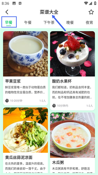 3、進入菜譜大全頁面,可按早餐、午餐等時段分類查看菜譜,了解不同菜品的制作時長、適用人數等信息,還能查看全部菜譜。
