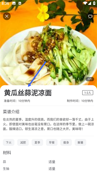 4、進入具體菜譜詳情頁,查看菜品的準備與制作時間、菜譜介紹,了解所需材料信息,還能通過收藏功能保存該菜譜。