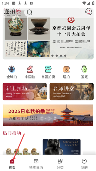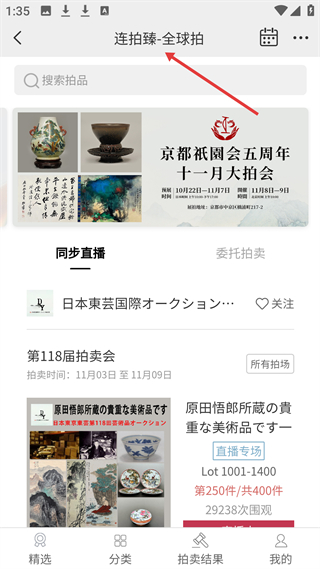 1、 首頁板塊,名為連拍臻,有全球拍等分類入口,展示京都祇園會大拍會,支持搜索功能,呈現藝術品拍賣內容。