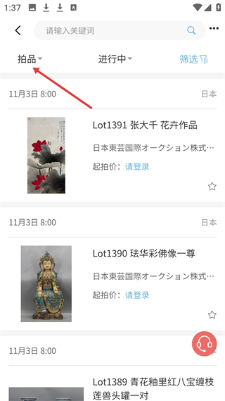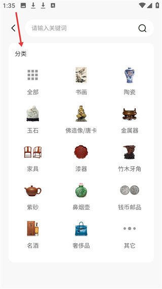 2、分類板塊,可按書畫陶瓷等品類篩選,覆蓋佛造像等藝術品類,方便用戶查找特定藝術品拍賣標的。