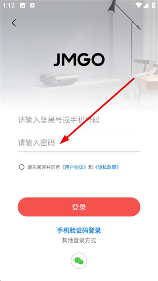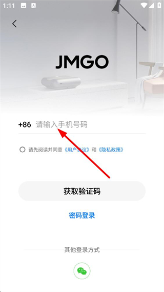 3、進入JMGO登錄頁面,可選擇輸入手機號碼獲取驗證碼登錄,也可選擇密碼登錄或其他方式,操作前需同意相關協議。