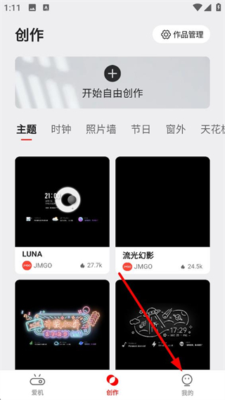 1、進入應用創作頁面可看到主題模板及開始自由創作入口,點擊底部我的選項,可進入個人中心頁面,該頁面包含登錄及服務設置等功能。